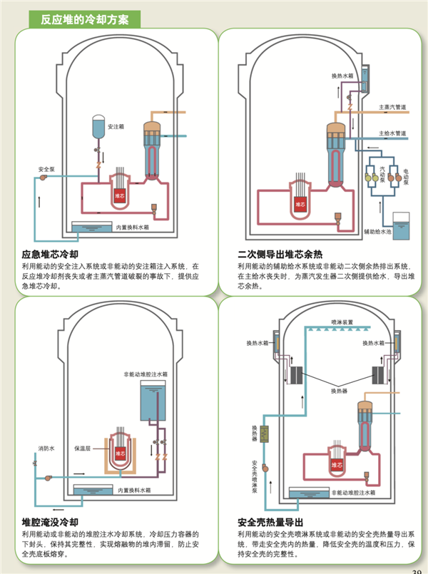 首先,在反应堆压力容器和蒸汽发生器上,都有一条紧急情况下备用的注水管道。在安全壳的顶部,还设有喷淋装置。