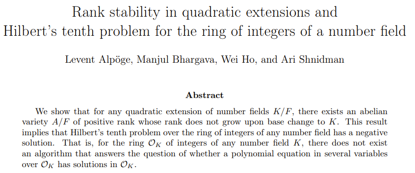 论文标题:Rank stability in quadratic extensions and Hilbert's tenth problem for the ring of integers of a number field