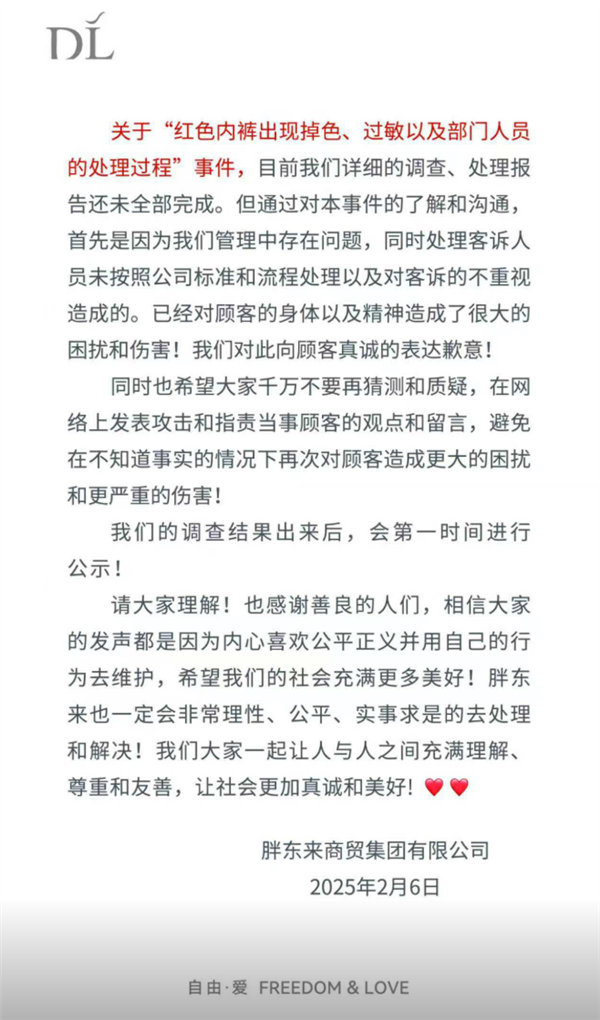 快科技2月6日消息,针对近日网传的“红色内裤出现掉色、过敏”情况,今日上午,胖东来商贸集团有限公司在官方抖音号再度发文,向顾客表达歉意。