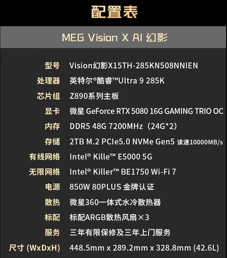 MEGVISION X AI幻影二代搭载NVIDIAGeForce RTX 5080显卡,基于全新架构与DLSS4.0技术,4K光追游戏帧率再攀新高;搭配英特尔酷睿Ultra9285K处理器,24核心32线程与5.8GHz睿频,轻松驾驭3A大作与多线程创作需求。整机采用微星定制散热方案与黄金功率配置,确保双旗舰硬件火力全开。