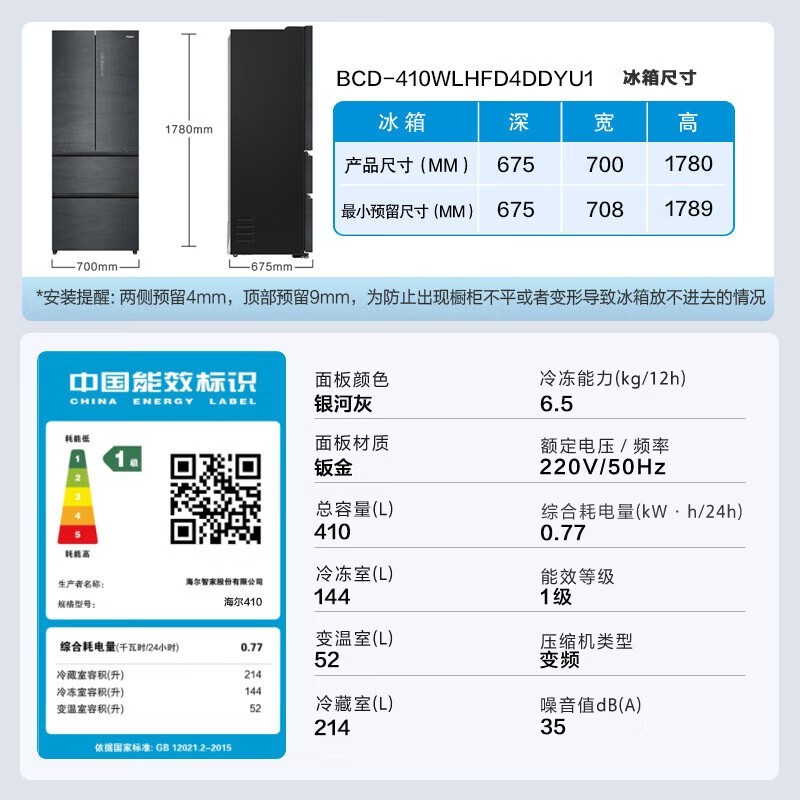 海尔Haier BCD-410WLHFD4DDYU1冰箱节能又静音,家庭必备!