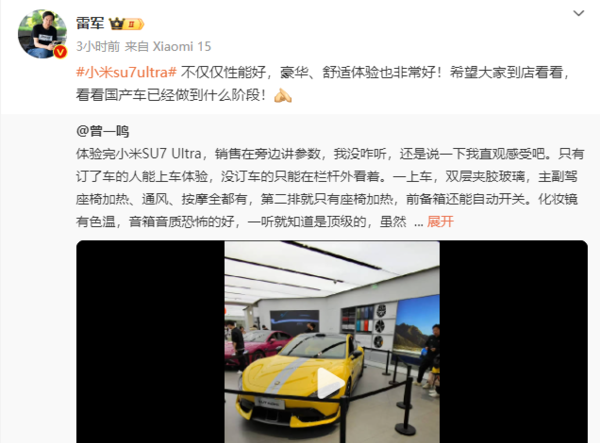 雷军推荐小米SU7 Ultra:看看国产车已经做到什么阶段