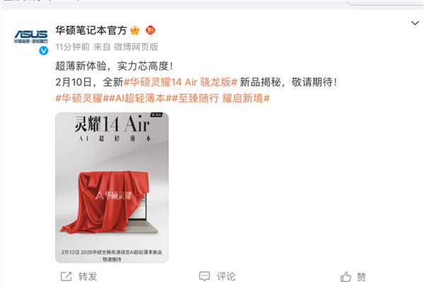 年初的CES 2025展会上,华硕首款搭载高通骁龙X Plus 8核心处理器的AI PC“灵耀14 Air骁龙版”首发亮相,获得创新大奖,如今已在京东平台上架预售,将在2月10日揭开神秘面纱。
