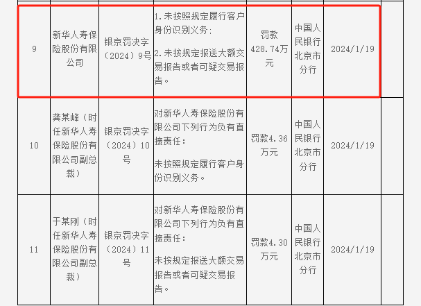 2024年1月26日,新华人寿保险股份有限公司被中国人民银行北京市分行处以罚款428.74万元。主要违法违规事实包括:“未按照规定履行客户身份识别义务;未按规定报送大额交易报告或者可疑交易报告”。时任新华人寿保险股份有限公司副总裁龚某峰、于某刚对上述行为负有直接责任,分别被处以罚款4.36万元、4.3万元。