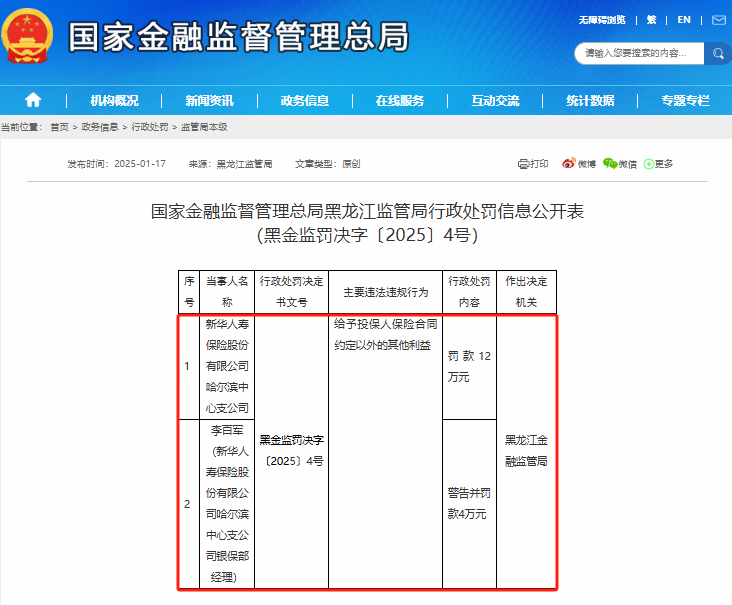 近期,黑龙江金融监管局公开披露了对新华人寿保险股份有限公司哈尔滨中心支公司的行政处罚信息。
