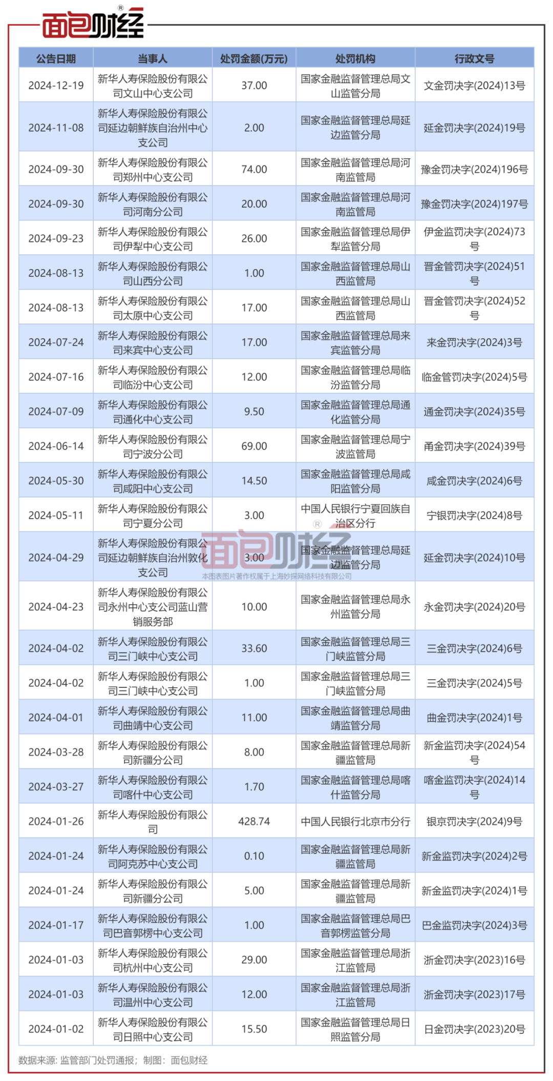 面包财经根据监管部门通报统计,2024年,新华保险及其分支机构收到监管部门开出的多张罚单,合计被罚没金额超800万元。其中,涉及1张超400万元的大额罚单。