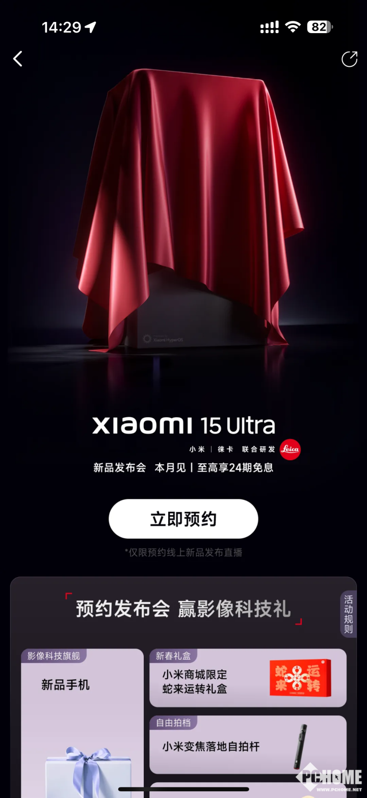 2025年2月6日,小米官方商城正式开启小米15 Ultra盲约活动。宣传海报显示,小米15 Ultra将于本月发布,至高可享24期免息。