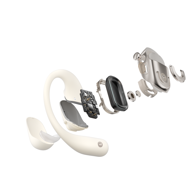 OpenFit 2升级采用了Shokz DualBoost™双引擎技术,创新性引入双单元结构设计,配备一颗直径5.5mm高瞬态平板单元和一颗21mm*11mm超大定制动态单元,前者可带来丰富饱满的高音层次,后者可带来充沛浑厚的低音效果,共同实现音感跃升。