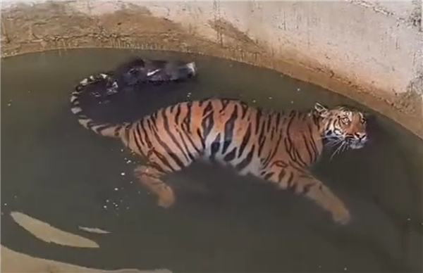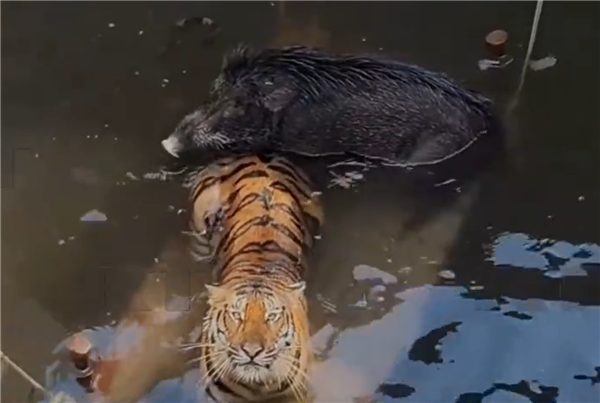 2月6日消息,老虎追野猪,俩一块掉井里了,放眼整个动物界,这也是非常罕见的一幕。