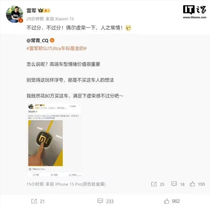 2 月 6 日消息,小米创办人、董事长兼 CEO 雷军今日午间在回应网友评论“小米 SU7 Ultra 金车标”时表示,“(满足下虚荣感)不过分,不过分!偶尔虚荣一下,人之常情!”