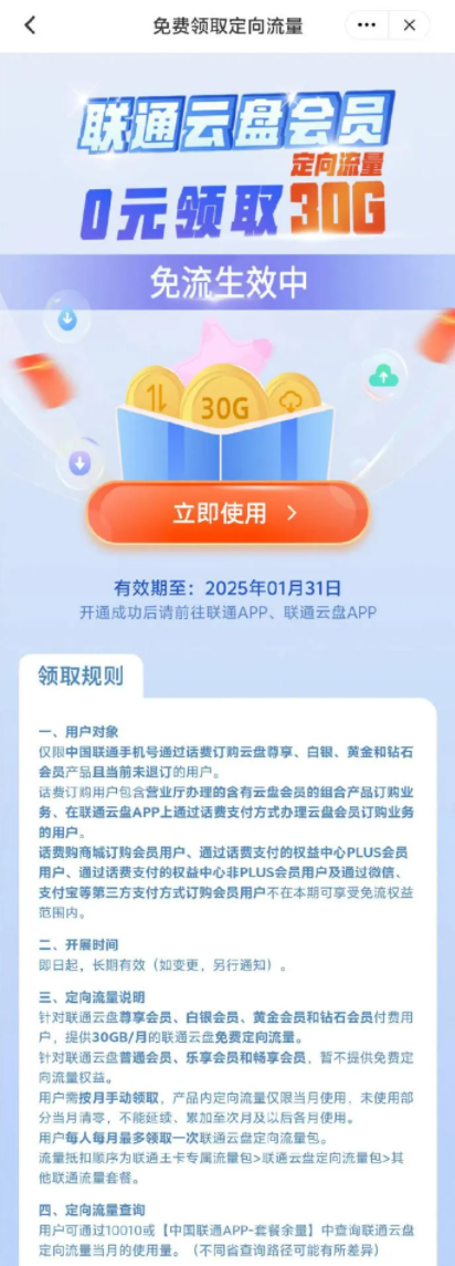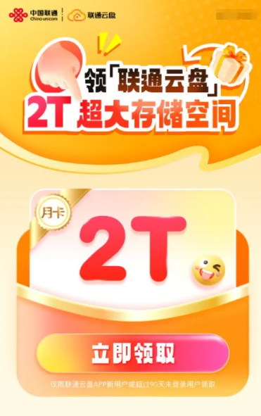 每月送30GB的免费手机流量,可以用于上传下载文件,也可以用于看片,非常实用。目前还有春节活动,联通云盘APP新用户活超过90天未登录用户,可以领取2T超大存储空间,30天会员特权畅享无忧,活动截止到2025年12月31日。