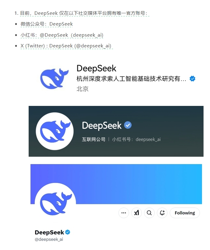 如未来 DeepSeek 在其他平台开设新的官方账号,将通过其他已有官方账号进行公告。与 DeepSeek有关的一切信息以官方账号发布为准,任何非官方账号、个人账号发布的信息均不代表 DeepSeek 观点,请大家注意甄别。