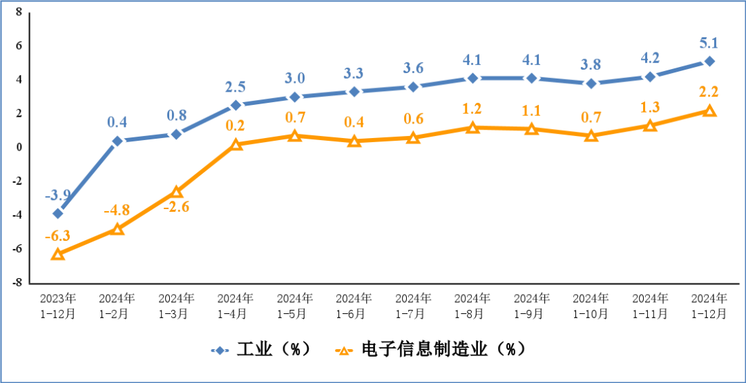 2024年,规模以上电子信息制造业增加值同比增长11.8%,增速分别比同期工业、高技术制造业高6个和2.9个百分点。12月份,规模以上电子信息制造业增加值同比增长8.7%。