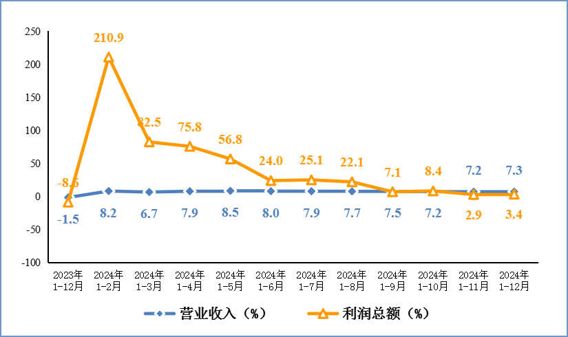2024年,规模以上电子信息制造业实现营业收入16.19万亿元,同比增长7.3%;营业成本14.11万亿元,同比增长7.5%;实现利润总额6408亿元,同比增长3.4%;营业收入利润率为4.0%,较1—11月提高0.04个百分点。12月份,规模以上电子信息制造业营业收入1.74万亿元,同比增长8.4%。