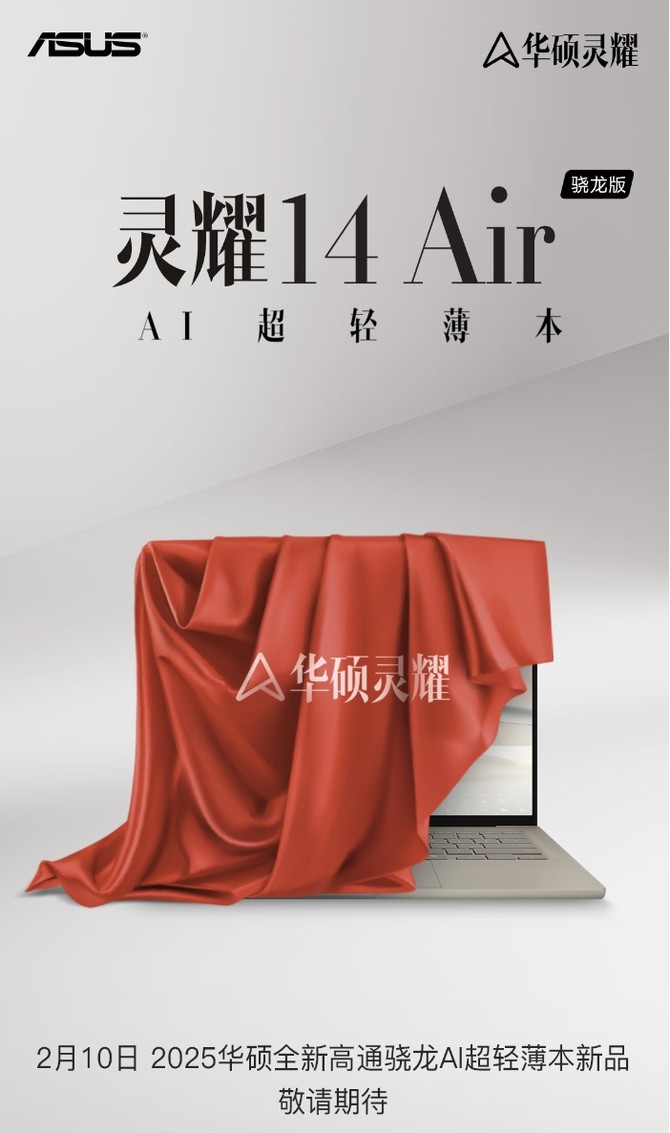 今天,@华硕笔记本官方 宣布,其全新灵耀14 Air 骁龙版AI超轻薄本将于2月10日正式发布,同时,电商页面已经开启预约,但价格并未公布。