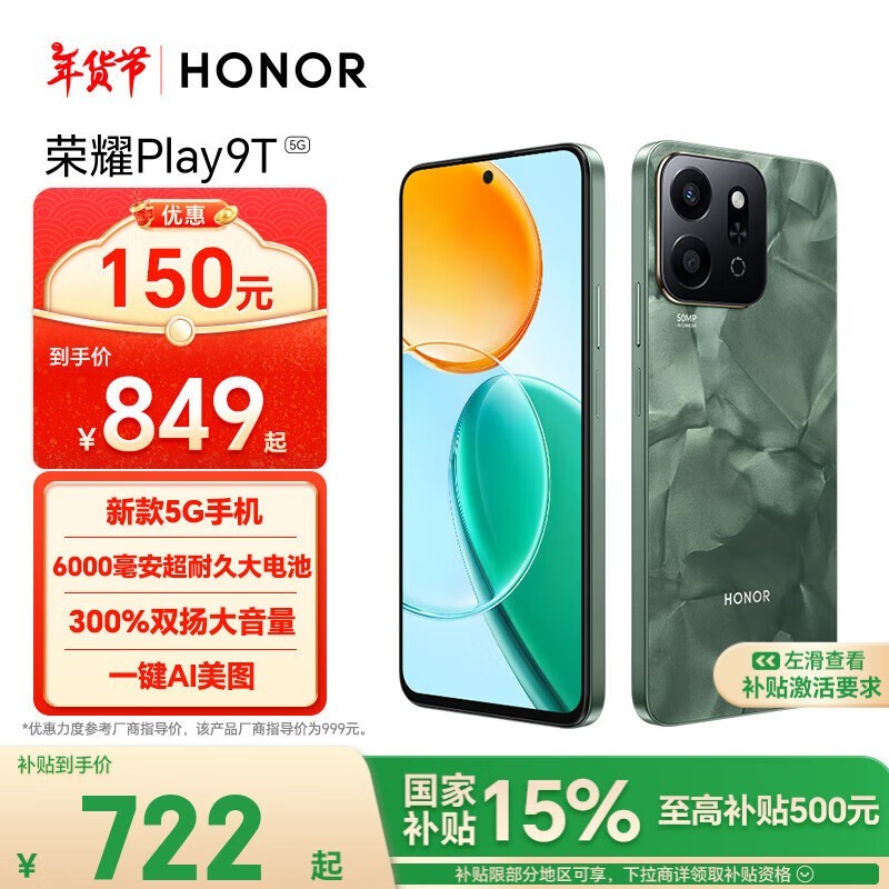 荣耀 Play9T 5G手机限时特惠,到手价只要789元!