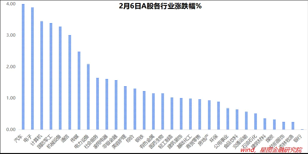 板块层面,31个一级行业均录得上涨,其中,TMT及高端制造相关行业领涨,银行、煤炭等红利类行业涨幅垫底。
