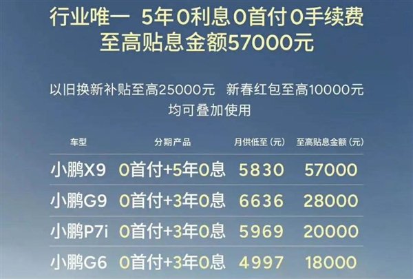这一政策即日起至2月28日结束,其中,小鹏X9成为行业首款推出0首付+5年免息政策的车型,最高贴息金额可达5.7万元,另外G9、P7i和G6三款车型,分别贴息为2.8万元、2万元和1.8万元。