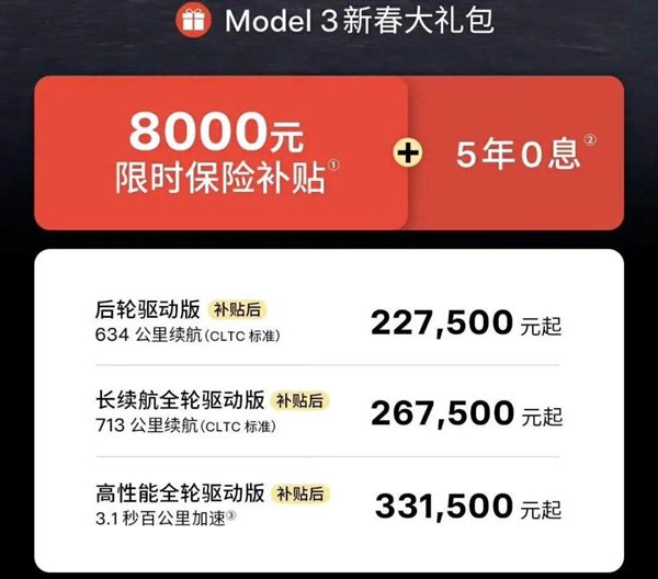 当天早上8点,特斯拉就推出Model 3史上最大力度的优惠组合方案——限时保险补贴8000元+5年0息政策+特享充电权益。