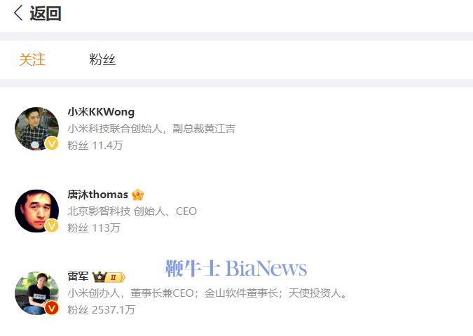 截至发稿,该账号还未发布任何内容,该账号关注的三个账号分别为:小米创办人、董事长兼CEO雷军和小米科技联合创始人、副总裁黄江吉以及北京影智科技创始人、CEO唐沐。