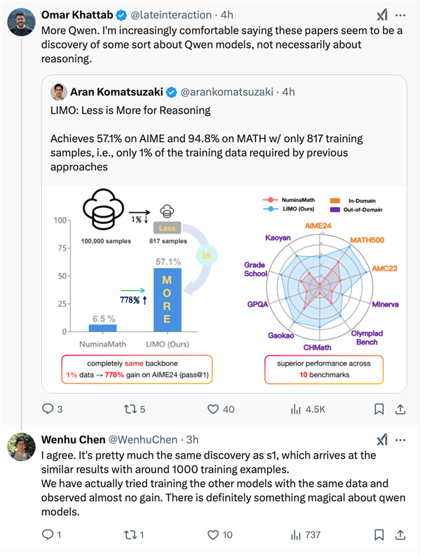 “以通义千问模型作为基座,确实可以用很少的样本数据就达到产生新的推理模型的效果,但如果换成其他基座模型,新模型能力却没有任何的提升。所以,能力真正神奇的是Qwen模型,而不是s1。 ” 谢伟迪说。