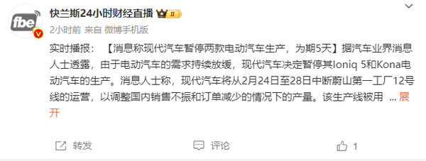 传现代汽车暂停两款电车生产 为期5天 因需求持续放缓