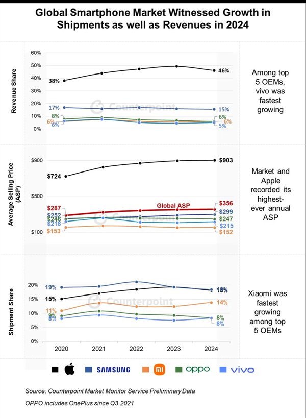 分析师Shilpi Jain表示:“2024年智能手机市场有许多积极因素,平均销售价格和出货量均有所增长。收入增长继续超过出货量增长,平均销售价格创下新纪录,这得益于手机品牌厂商对高端市场的不断关注、消费者对高端设备的需求增加以及投入成本的上升。