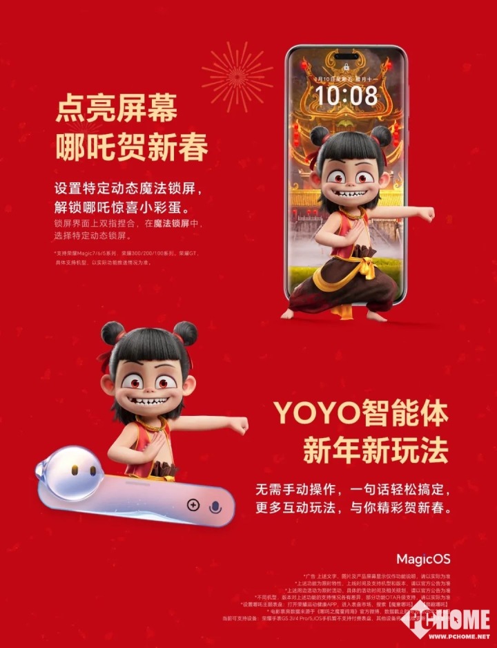 在与《哪吒之魔童闹海》的风火联动中,荣耀基于MagicOS相关魔法科技功能,带来一系列超乎想象的魔法般互动体验:此前,荣耀已陆续上线了哪吒贺春魔法锁屏、哪吒之魔童闹海主题、哪吒和敖丙相机水印、YOYO智能体一句话拜年彩蛋、哪吒数字人魔法锁屏等一系列个性化功能,将魔法科技融入新春佳节,年味分外浓郁,让消费者感受到了不一样的节日氛围。