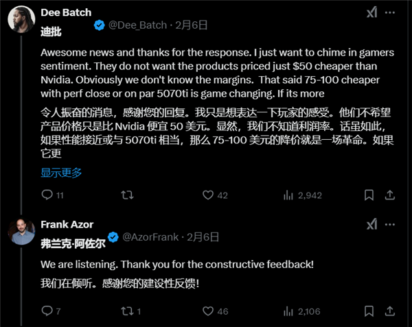 对于网友在价格方面的建议,他还回复称“AMD正在倾听消费者的意见”,表明AMD可能考虑采取更具竞争力的策略。