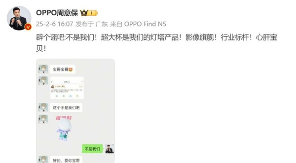 OPPO Find系列产品负责人周意保在社交平台发文称:辟个谣吧:不是我们!超大杯是我们的灯塔产品!影像旗舰!行业标杆!心肝宝贝!超大杯旗舰机型作为各家站稳高端的定海神针级产品,往往凝结着品牌最顶尖的技术,所投入的研发费用也是高昂的,而这也需要得到市场的认可才能够不断延续更新下去。随着OPPO的辟谣,那么决赛圈也进一步缩小,到底是哪一家要率先取消超大杯机型呢?