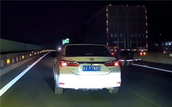 跟随期间视频车也试图通过开远光灯的方法进行反击,让卡罗拉驾驶员要么快速超过去,要么变道给自己让路,但卡罗拉司机依旧不理不睬。