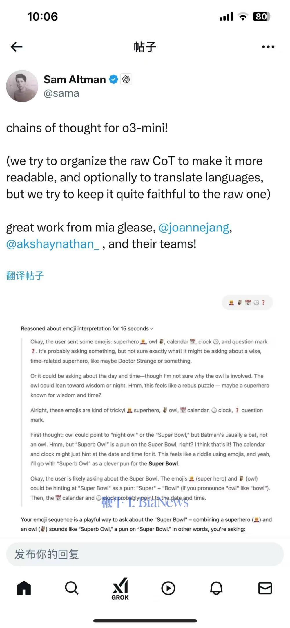 Sam Altman发文表示,我们尝试整理原始的o3-minil思维链,使其更具可读性,并选择性地翻译语言,但我们尽量保持与原始内容的高度一致。