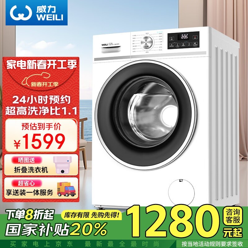 威力大容量变频滚筒洗衣机:3D蒸汽预洗+24小时预约,96℃高温除菌,智能高效仅售1499元