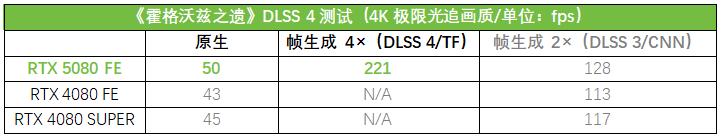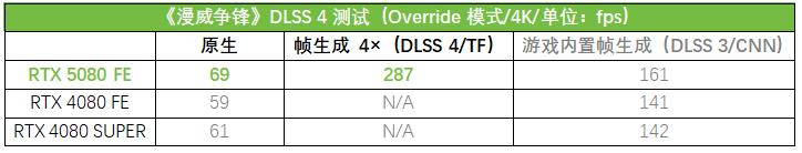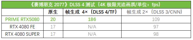 首先来看看3DMarkDLSS 4功能测试的结果。从测试成绩来看,PRIMERTX5080在使用TF模型的DLSS4下开启4x、3x和2x帧生成,分别相对原生帧率提升了494%、388%和259%,提升幅度非常夸张!而在2x帧生成下使用TF模型相对使用CNN模型也有6%的提升。特别值得一提的是,RTX4080和RTX4080 SUPER在这个测试中也可以使用TF模型开启2x帧生成了,相比使用CNN模型,也有11%左右的提升。显然,DLSS4不仅显著提升了PRIMERTX5080的性能,即便是对于上一代的RTX40系列GPU,新模型同样能够带来效率上的提升!