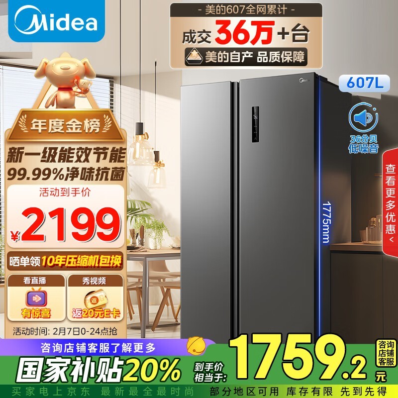 美的 BCD-607WKPZM(E) 双开门冰箱,1698元!