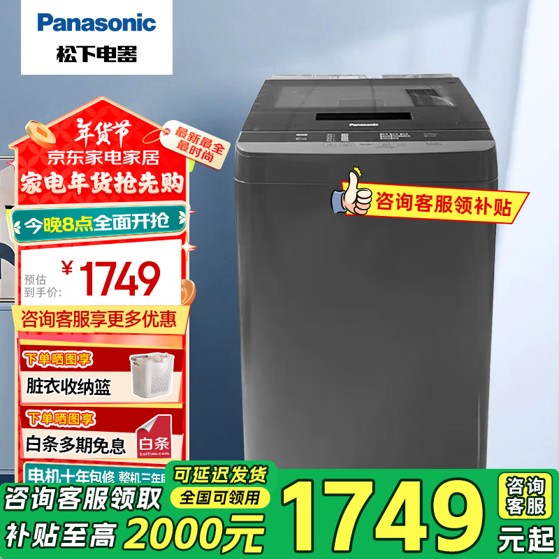 松下XQB100-Q182大容量智能洗衣机:10公斤宽瀑直筒,一键智慧洗,优雅高效仅售2058元