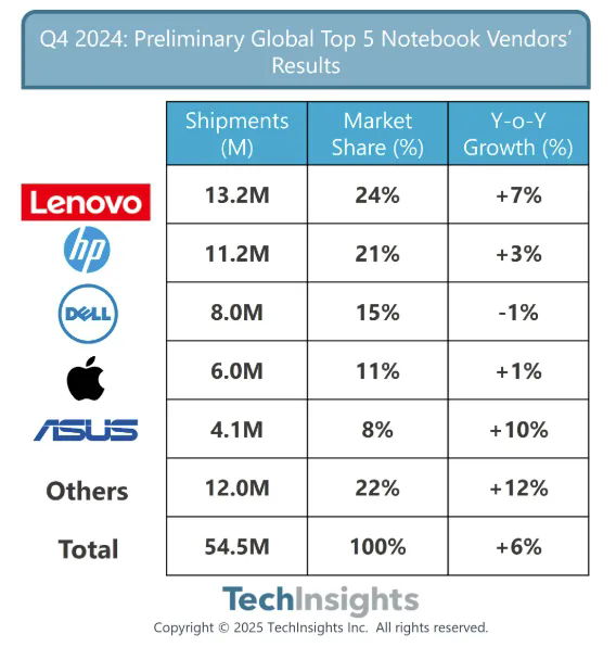 2024年Q4全球笔记本电脑出货量达5450万台 联想第一