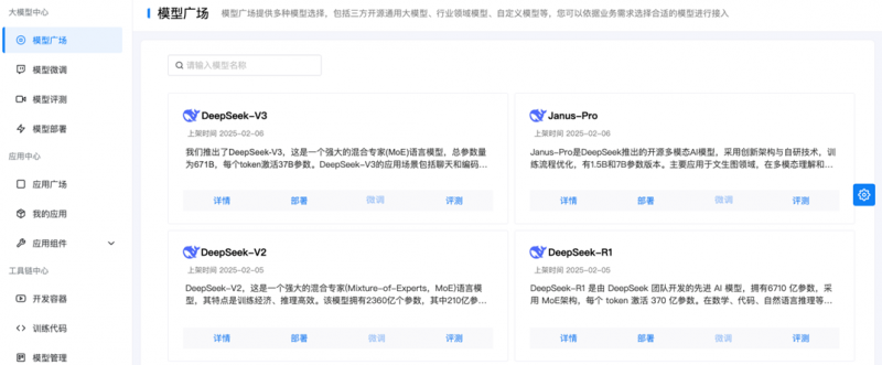 在优咔“遨云”大模型应用平台中,已全面开展包括R1在内的DeepSeek全系列模型适配工作,以满足不同规模参数量模型的个性化部署需求。目前可一键本地部署体验DeepSeek,近期将开放微调功能。