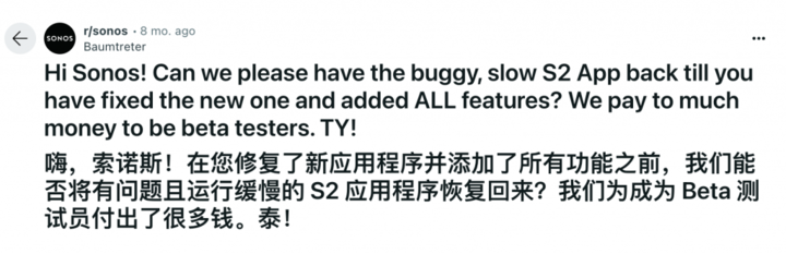 一时间,Reddit 和 Sonos 官方论坛都充满了用户关于 bug 和稳定性的抱怨,以及一些询问回退方法或者替代方案的求助帖。