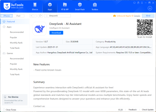 值得一提的是,在美国、意大利、澳大利亚、韩国等国以 “潜在安全和道德问题” 为由对DeepSeek进行限制封杀背景下,天娱数科移动应用分发平台海外版3utools也已上架DeepSeek,为其提供海外下载渠道。据公开信息,其3utools平台总注册用户已达4737万月活跃用户达208万。