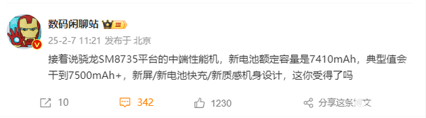 近日,知名数码博主“数码闲聊站”爆料称,搭载骁龙SM8735平台的中端性能机,将搭载典型值超7500mAh的大容量电池。据推测,该产品为REDMI Turbo 4 Pro。