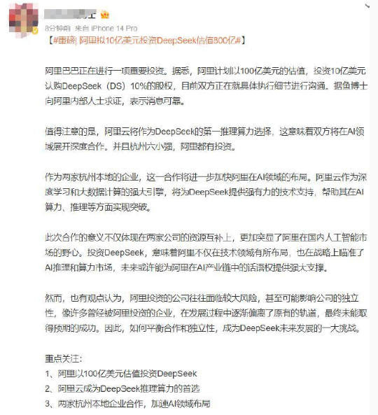 然而,也有业内人士对阿里巴巴的投资行为表示了担忧。他们认为,阿里投资的公司往往面临较大风险,甚至可能影响公司的独立性。历史上,许多曾经被阿里投资的企业在发展过程中逐渐偏离了原有的轨道,最终未能取得预期的成功。因此,如何平衡合作和独立性,成为DeepSeek未来发展的一大挑战。