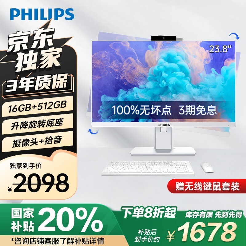 飞利浦23.8英寸高清办公一体机电脑台式主机仅售1678元