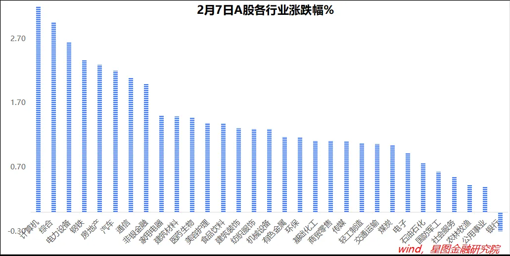 行业层面,31个一级行业里,仅银行板块逆势收跌0.32%;计算机(4.45%)、综合、电力设备、钢铁、房地产、汽车、通信等涨幅靠前,均超过2个百分点。