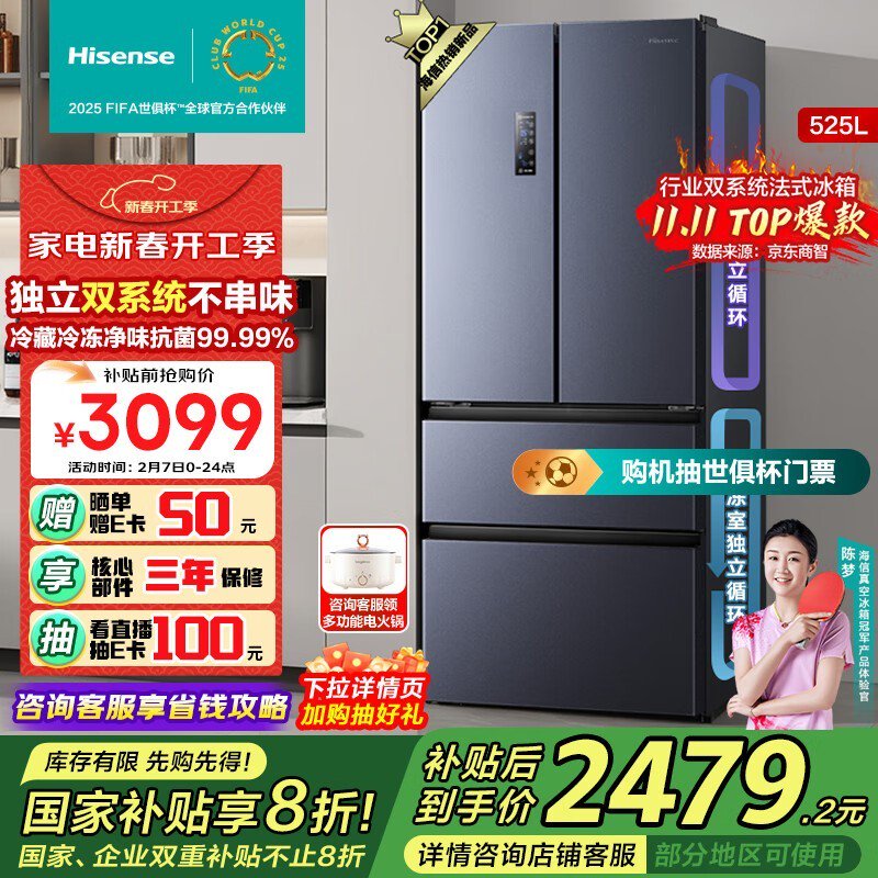 海信BCD-525WNK1PU多门冰箱限时优惠仅需2076元