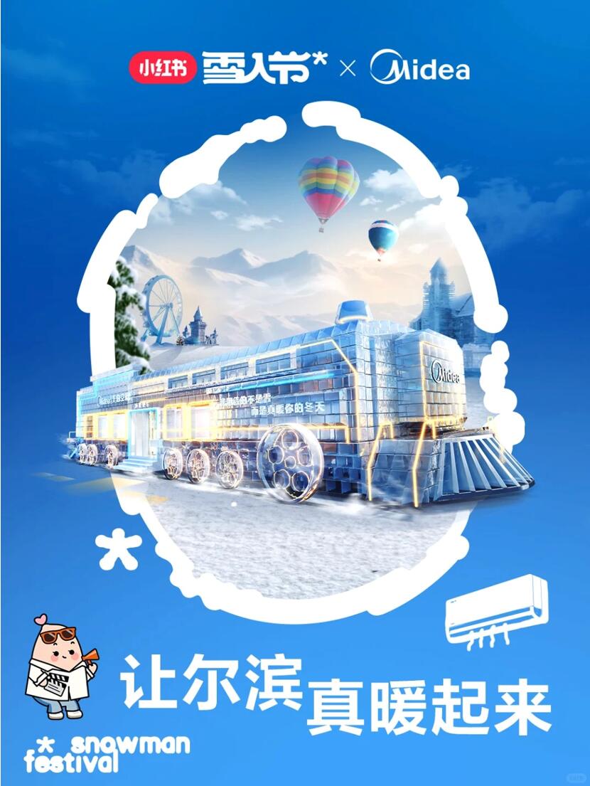 在哈尔滨冰雪大世界,美的空调搭建了一座长12米、宽6米、高4米的“真暖快车”冰屋,为游客带来凛冬之下的温暖体验。为应对冰雪大世界零下三十多度的寒冷天气,“真暖快车”采用了供水温度可达60℃的美的真暖空气能中央空调进行供暖。