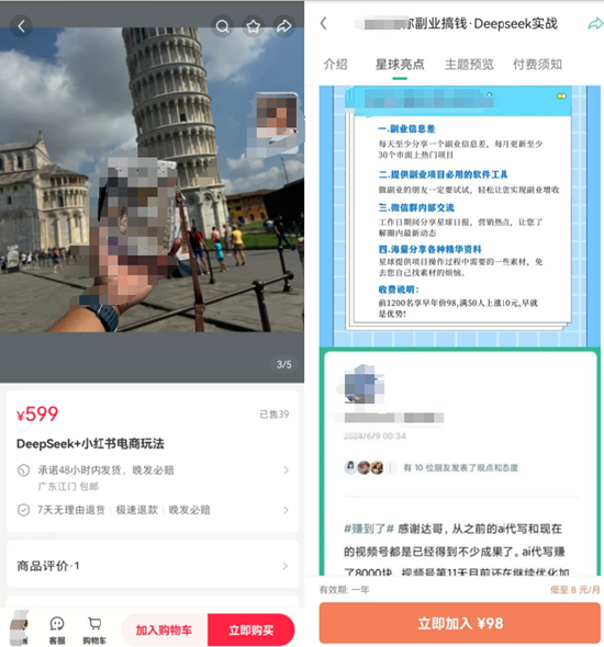 此外,也有卖家直接假借DeepSeek名义引流,卖起“小红书电商玩法”“副业搞钱”等“挂羊头卖狗肉”的课程,这些课程价格在98元-599元不等,有的则是直接与DeepSeek无关,纯粹是借助DeepSeek的市场热度进行引流。