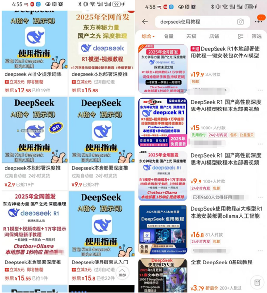 在淘宝、拼多多等平台上,目前已经出现大量的DeepSeek使用及快速上手教程,号称可帮用户学会使用DeepSeek,价格普遍在10元-20元之间。一个值得注意的现象是,这类教程多与DeepSeek的“本地化部署”等AI服务相结合。