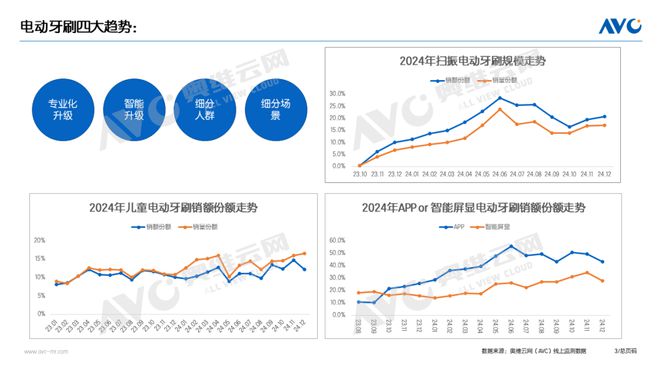 电动牙刷行业经历了2023年的小阳春之后,再次进入到负增长阶段。导致这一现象的主要原因是前期市场需求的过度释放以及抖音渠道销售规模的饱和。然而,从产品端来看,电动牙刷行业仍呈现出一些可圈可点的发展方向。