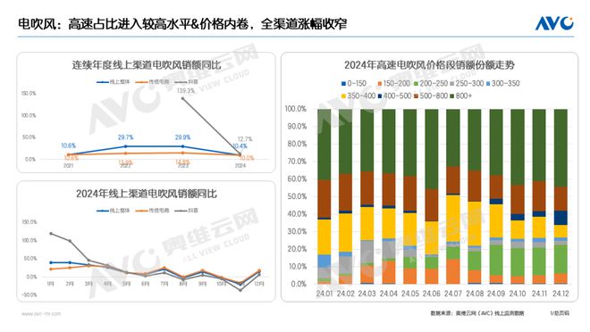 在过去数年中,高速电吹风的二次升级成为推动电吹风行业持续增长的重要动力。然而,从2024年市场规模来看,电吹风线上全电商渠道涨幅明显收窄。上半年,行业延续了此前的高速增长态势,但自10 月、11月起,市场销售额开始呈现下滑趋势。这主要归因于高速电吹风在市场中的占比已达到较高水平,产品同质化现象严重,导致行业缺乏新的高增长动力;此外,激烈的价格竞争也对行业销售额产生了负面影响。
